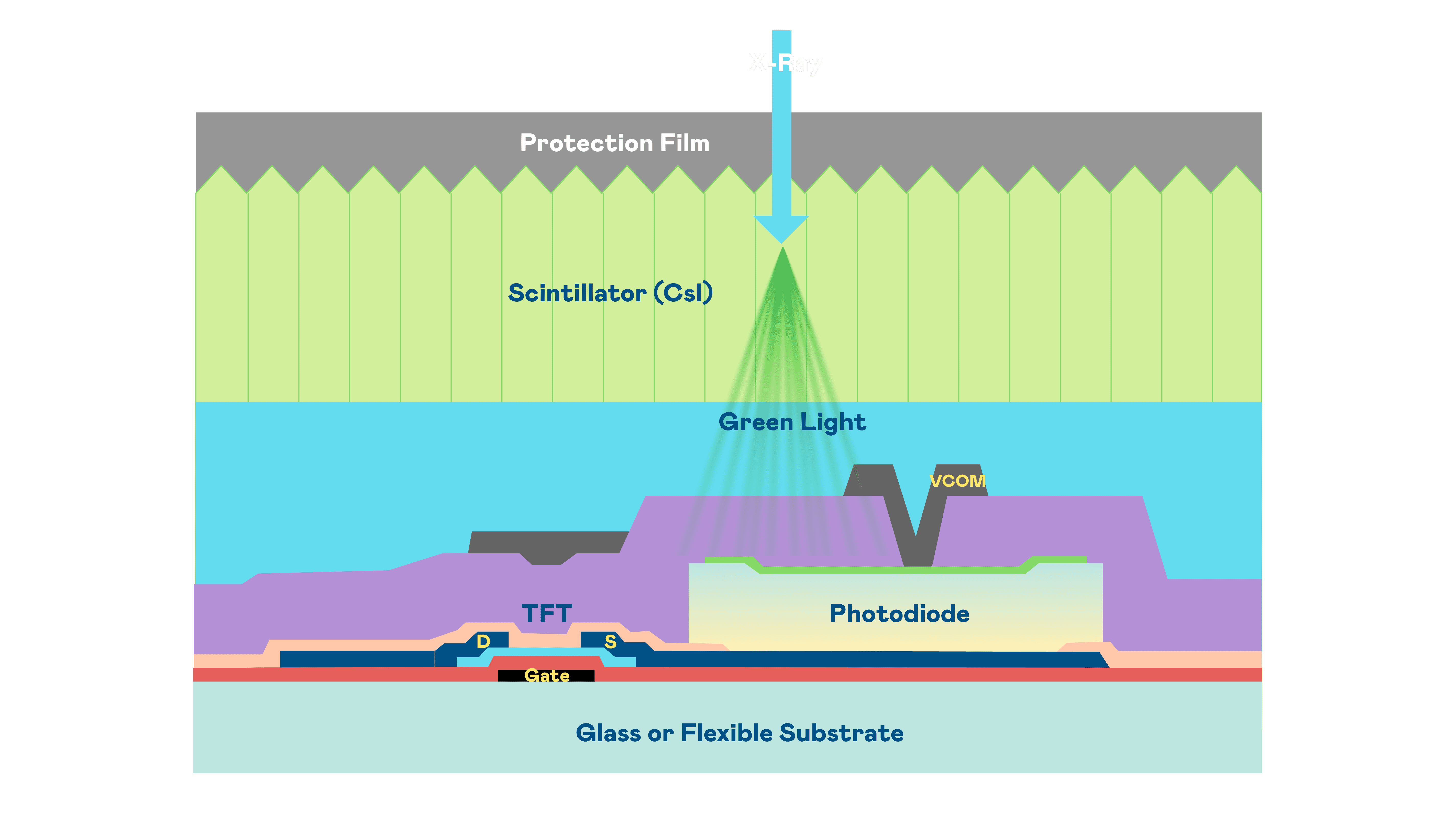 NG大舞台的X光影像感测阵列使用薄膜电晶体 (TFT) 作为每个像素的读取开关,,,搭配光电二极体(Photodiode)的光电转换元件,,,用以感测X光影像讯号。。